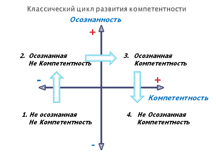 Итак, событие произошло и, несмотря на наше сопротивление, мы теперь знаем, что в наших знаниях или умениях есть пробел. Если цель заманчива, у нас есть честолюбие и мы приложим некоторые усилия, мы осознаем, в чем именно состояла наша некомпетентность, и можем стать осознанно компетентными (пройти курс, прочитать книгу, закрепить на опыте).