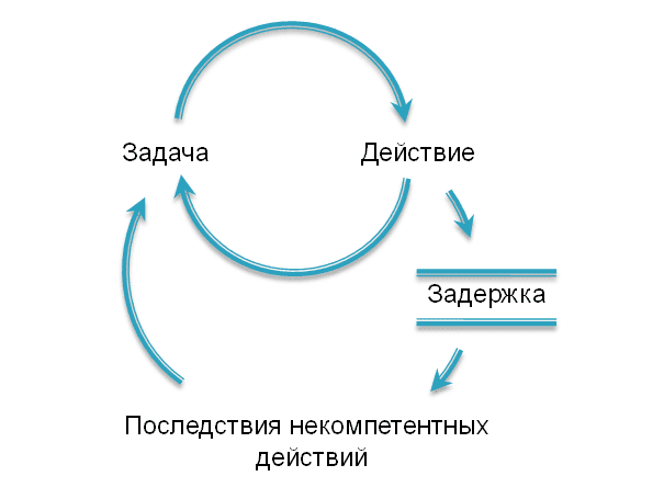 Особую опасность представляют собой ситуации с встроенной задержкой или c недостаточной обратной связью на действие руководителя или специалиста. Эта ситуация схожа по структуре с системным архетипом «неработающее решение». Решения и действия вполне «компетентные» для контекста, в котором происходила интернализация знаний и фиксация рефлексов, могут привести к очень серьезным последствиям, таким как разрушение карьеры или техногенные катастрофы.